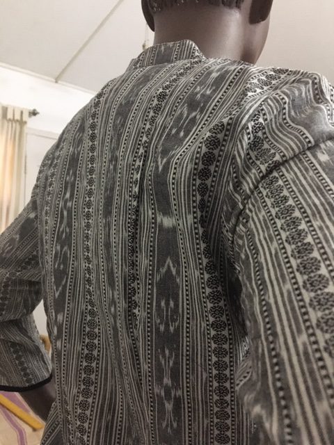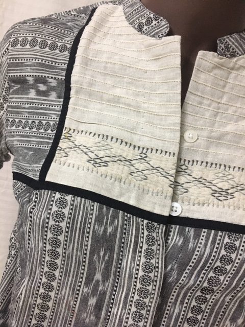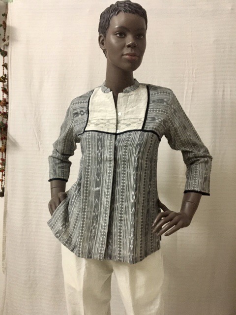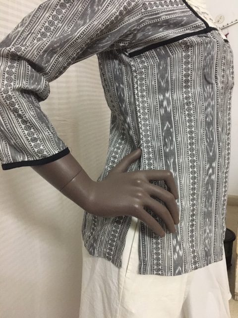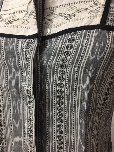 Ikat, monochromatic colours woven ikat cotton shirt. Designed yoke a with delicate hand embroidery in same colour threads and pin tuck and black cotton fabric piping enhances the feminine look and fit of this beautiful shirt. Double flap, invisible button panel completes the garment!