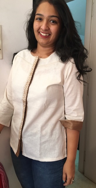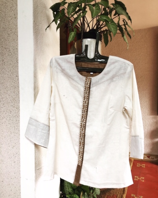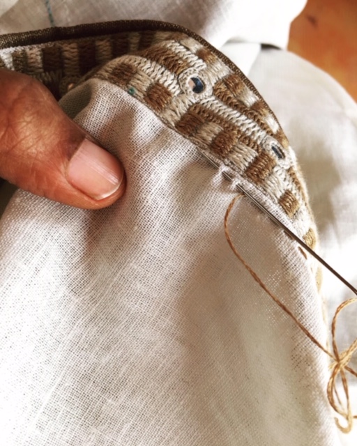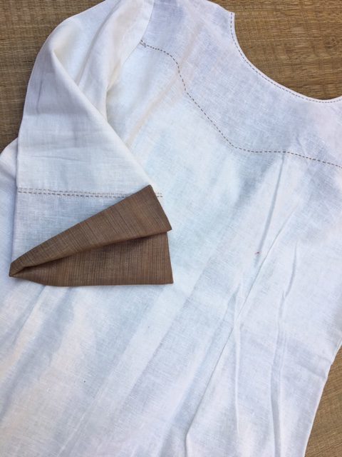 Classic, off-white linen Shirt, button panel highlighted with hand embroidery in shades of beige and brown. Silk fabric in the matching shades of the embroidery adds an interesting appeal, finishes delicately with running hand stitches in parts of the shirt. Fold up sleeves brings up the silk as a additional colour to the neutral colour of the shirt.