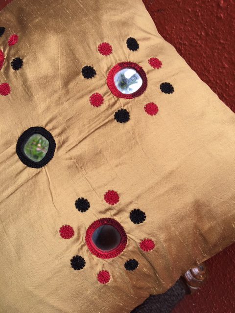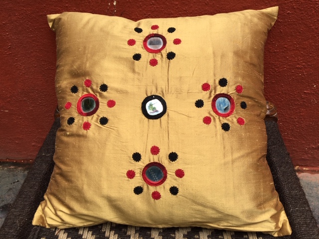 Dupion silk cushion covers are designed with mirror work pattern inspired by nature, moon and stars; in shaded monochromatic colours. Fine and delicate all over design is hand embroidered by our Gypsy community.