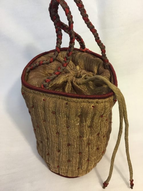 Silk blend pouch bag; Designed delicately with braided handles in rich royal colours, soft finished pull string to operate the bag.Quilted and hand embroidered with fine beads n sequence.