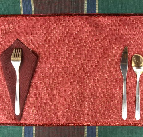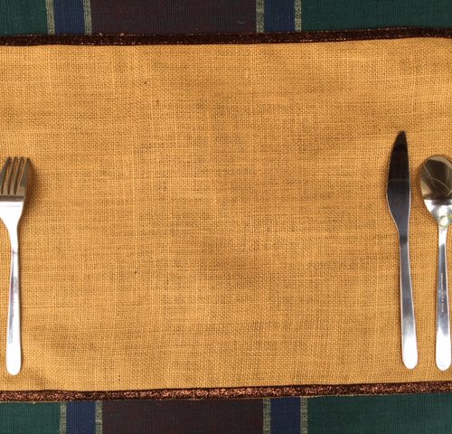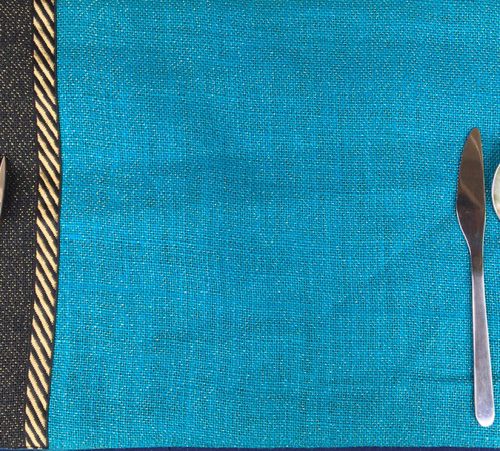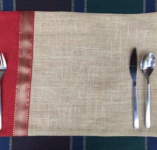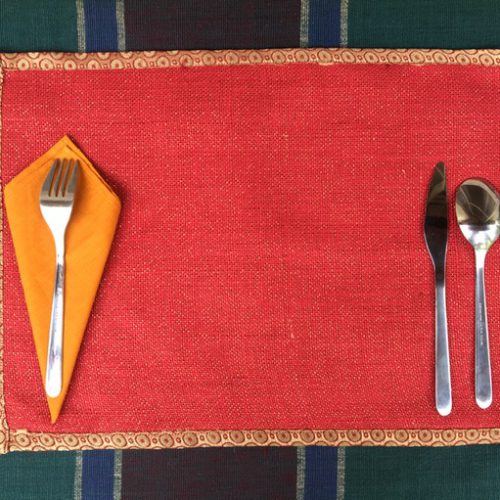 Festive jute table mats uplifts the dining experience. Hand woven jute with lurex adds a subtle sparkle to the fabric. The table-mats are lined with thick cotton fabric and edged with trims.